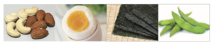 ナッツ類、炒り大豆、ゆで卵、 食べる煮干、焼き海苔、枝豆など
